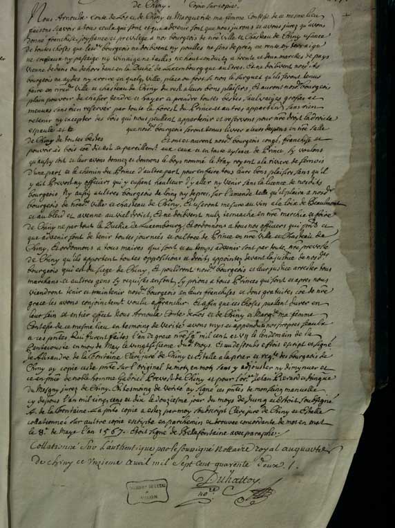 Le rôle commercial de Chiny est difficile à cerner. De longue date, les habitants de cette minuscule capitale bénéficient de substantiels privilèges. Mention est déjà faite en 1173 des liberi homines et castelani de Chisnei. Après l’abandon du château au profit de ses résidences d’Ivois et de Montmédy, le comte Arnoul IV tente en 1301 d’y fixer une population moins chichement comptée et de développer les échanges. Il octroie des privilèges inouïs aux bourgeois : exemption de toute imposition (rente de bourgeoisie, terrage, cens des prés… mais aussi aides, corvées – le surguet excepté – tailles, fiscalités commerciales), pleine liberté en matière de chasse, jouissance d’un bois. Il les affranchit des tonlieux aux marchés et foires de Chiny (ville ou comté ?) et du Luxembourg. On n’oserait affirmer que l’extension du privilège à la seconde principauté était bien inscrite dans la version originale de l’acte. Il est encore précisé que les bourgeois useront mesure au vin à la loi de Beaulmont, et au bleid et avenne au viel droict, indice probable de l’ancienneté du marché local. A la fin du siècle, Chiny possède une halle et accueille des lombards.